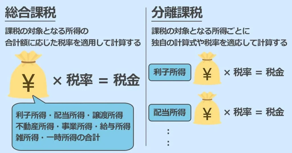 分離課税とは異なり税率は一律ではなく、課税の対象となる所得の合算所得(年収や投資収益、その他の所得など)に応じて課税されます。